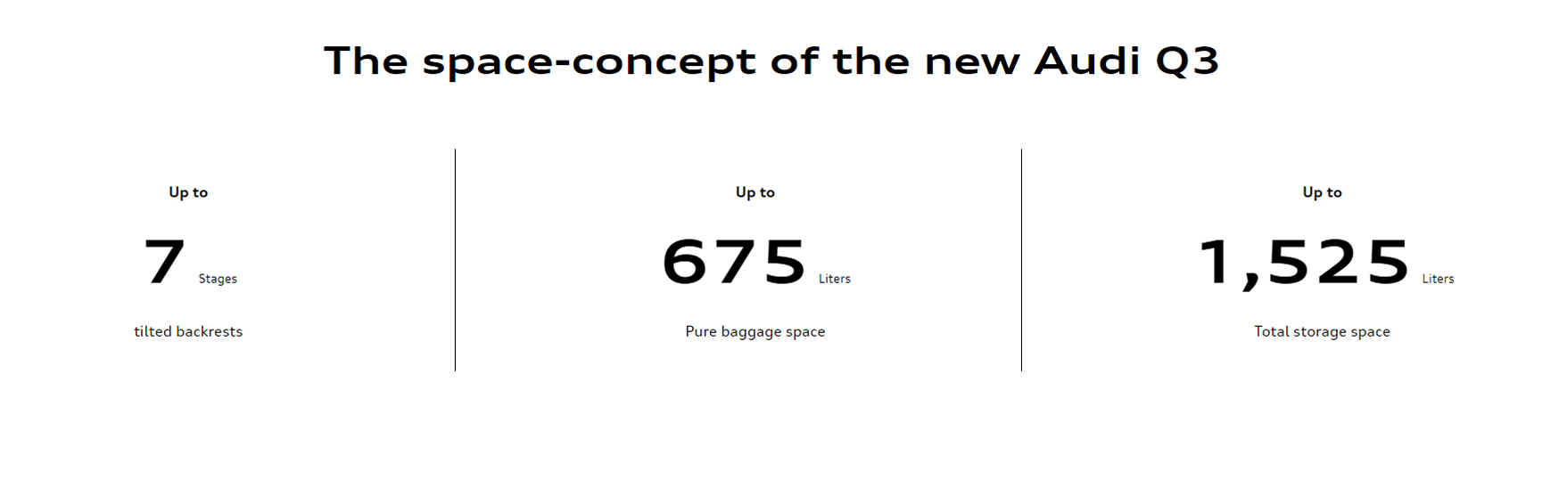 The new Audi Q3 is a family SUV with great all-round talents. In the second generation it appears not only visually more self-confident, but offers far greater utility value thanks to abundant space, comprehensive adaptability and many practical details. The Singleframe in octagon design and large side air inlets characterize the masculine front-end. Large and adaptable: Depending on the position of the rear seats and backrests, the luggage compartment capacity totals 530 or 675 liters (18.7/23.8 cu ft). With the backrests folded down the figure rises to 1,525 liters (53.9 cu ft). Furthermore the new Audi Q3 features a digital cockpit and a large MMI touch response Numerous infotainment solutions from the full-size segment connect the compact SUV with its environment.